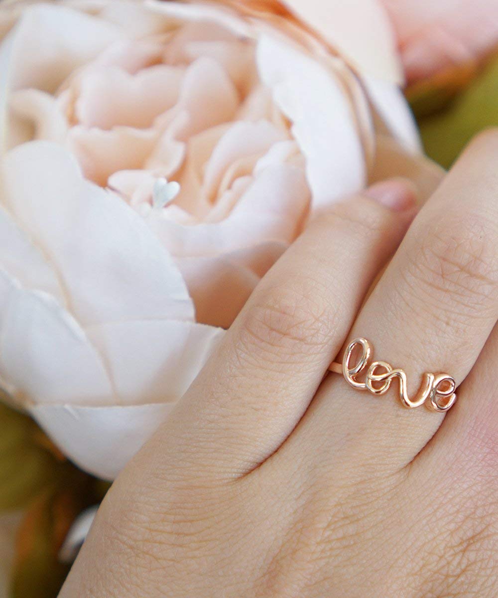 Lovely gold love ring metal type 14k gold filled tarnish resistant and nickel free also available in 925 sterling silver please contact me for pricing on a sizes smaller than 4 or larger than 11. The quality is excellent and the seller got it to me quick. They look very similar to the stackable rings but the font goes vertically rather.